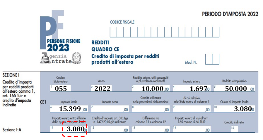 Nel caso in esame abbiamo un’imposta estera complessivamente pari a 1.697 (aliquota media 16,97%), perfettamente capiente rispetto all’imposta italiana a cui corrisponde quella quota reddito – che sarebbe pari ad euro 3.080 – da cui il via libera alla detrazione integrale in Italia del tributo adempiuto all’estero.