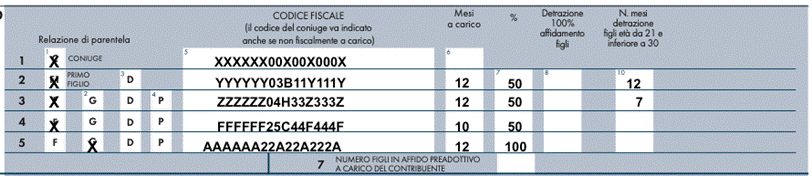 Si veda di seguito un esempio di compilazione del prospetto relativo ai familiari a carico.