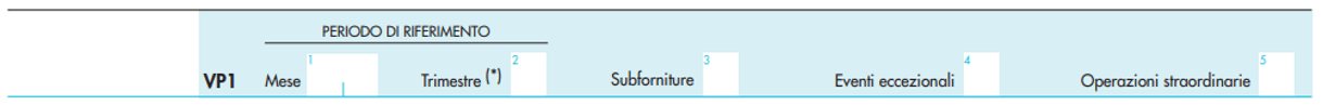 Nel campo “Periodo di riferimento” occorre compilare le colonne 1 e 2 del rigo VP1 con il mese (valori da 1 a 12) oppure il trimestre (valori da 1 a 4), cui si riferisce ciascun modulo della comunicazione. I contribuenti che eseguono liquidazioni trimestrali, ai sensi dell’articolo 7, D.P.R. 542/1999, devono indicare, in colonna 2, il valore “5”, con riferimento al quarto trimestre solare.