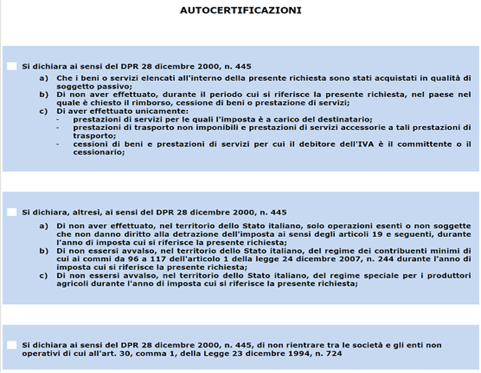 - Autocertificazione del possesso di alcune condizioni necessarie affinché il soggetto passivo sia legittimato a chiedere il rimborso