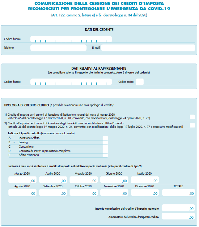 L’articolo 122, comma 2, lett. a) e b), D.L. 34/2020 ha previsto, per i soggetti beneficiari dei crediti d’imposta relativi alle locazioni, introdotti per fronteggiare l’emergenza epidemiologica da Covid-19, la possibilità, in luogo dell’utilizzo diretto, di optare per la cessione, anche parziale, degli stessi ad altri soggetti.