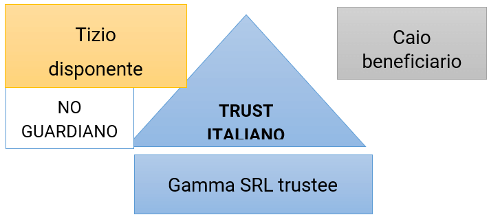 Siamo in presenza di un trust domestico privo di guardiano ove Tizio è disponente e Caio è Beneficiario. Il trustee è Gamma srl con Sempronio amministratore. Il trust controlla al 100% Alfa srl, amministrata da Mevio.