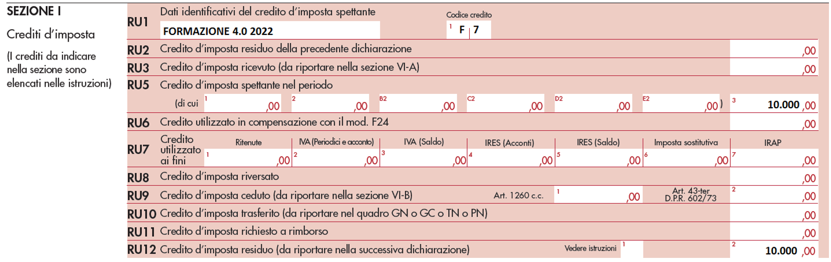 Nel rigo RU1, il codice da indicare per identificare il credito formazione 4.0 è F7. Nella sezione I, del quadro RU possono essere compilati i righi RU2, RU3, RU5 colonna 3, RU6, RU8, RU10 e RU12.