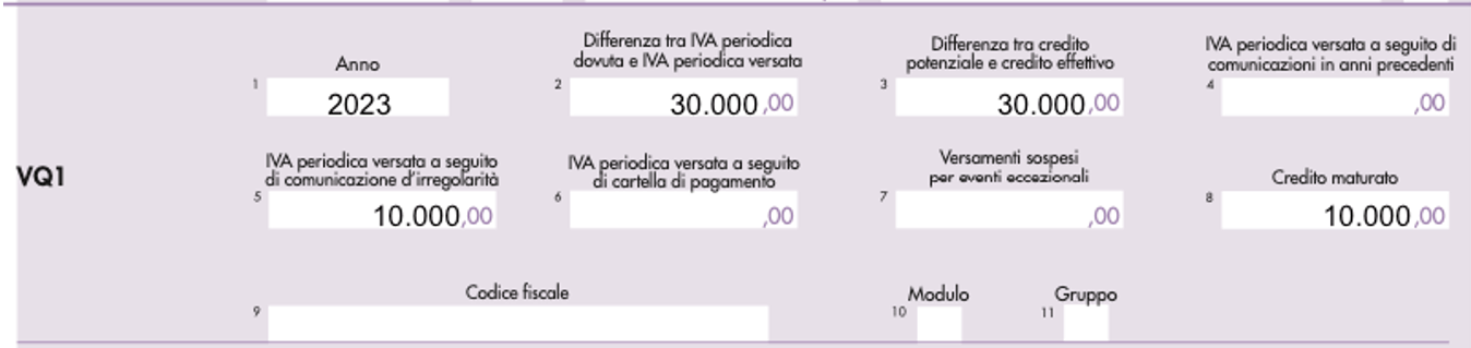 Il quadro VQ si compone di 5 righi, da VQ1 a VQ5, che possono riguardare fino a 5 periodi di imposta.