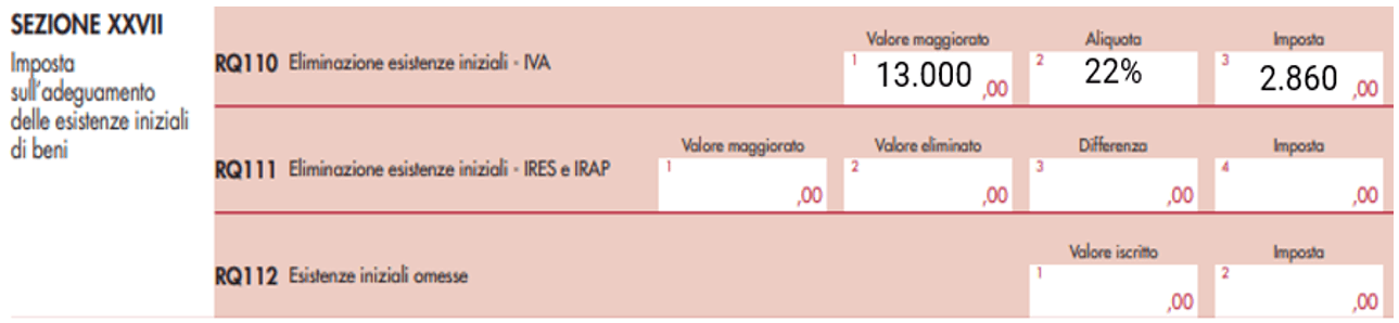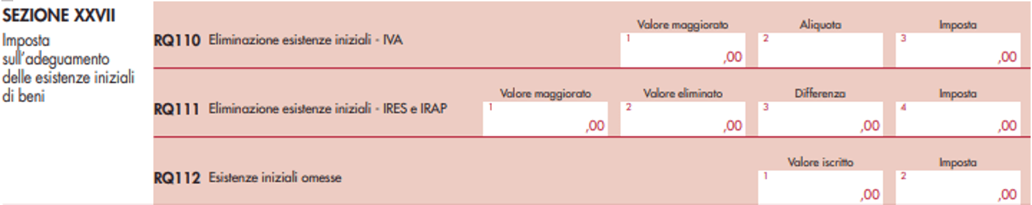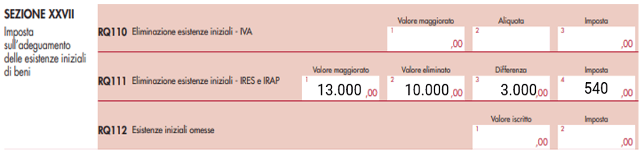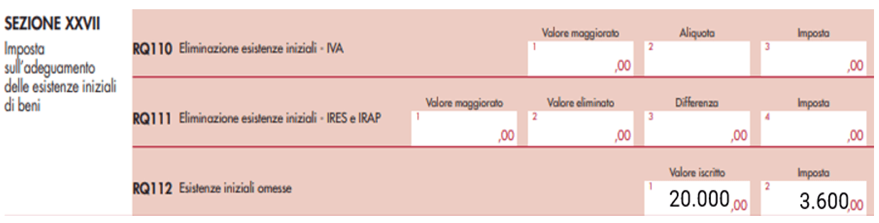 In particolare, occorrerà compilare la sezione XXVII del quadro RQ righi da RQ110 a RQ 112 rubricato “imposta sull’adeguamento delle esistenze iniziali di beni”