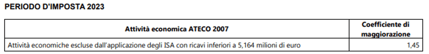 - NON sono stati approvati gli ISA e abbia dichiarato ricavi di importo non superiore a 5.164.569,00 euro. In questo caso, occorre fare riferimento all’unico coefficiente fissato dall’allegato 3 del DM 24.6.2024 per tutte le attività economiche, pari a 1,45).