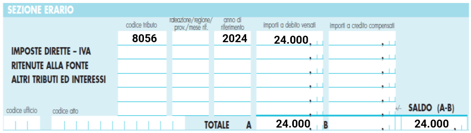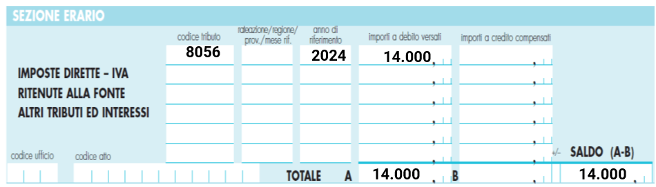 L’imposta dovuta, pari ad euro14.000 = (euro 16.000 – euro 2.000) è stata versata in un’unica soluzione in data 12.6.2024.