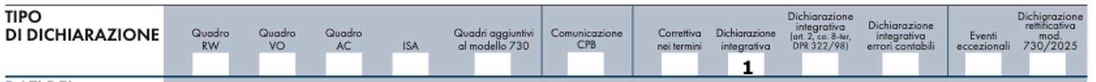 - di presentare, tramite un professionista abilitato o un centro di assistenza fiscale, un nuovo modello 730/2025, completo di tutte le sue parti ed integrato con i nuovi dati, entro e non oltre il 25 ottobre 2025, indicando, all’interno del frontespizio, nella casella denominata “730 integrativo”, il codice “1”;