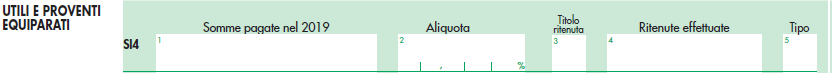 Il quadro SI deve essere utilizzato per indicare gli utili, pagati nell’anno 2019, derivanti dalla partecipazione in società ed enti soggetti ad Ires, nonché per l’indicazione dei dati relativi ai proventi equiparati agli utili. Gli utili devono essere indicati con esclusivo riferimento alla data di incasso: non rileva la data di delibera dei dividendi.