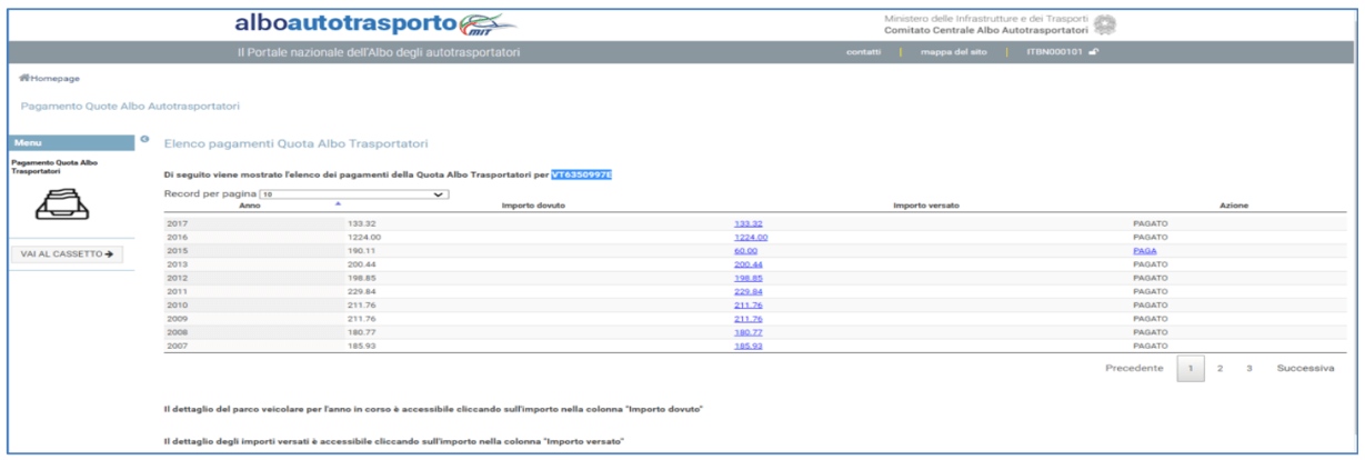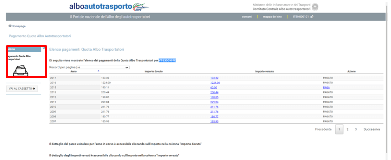 - cliccare il link del menù laterale di sinistra “Pagamento Quota Albo Trasportatori”, per visualizzare l’elenco delle quote albo differenziate per anni.