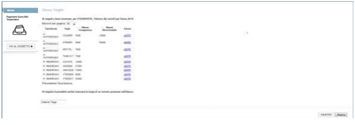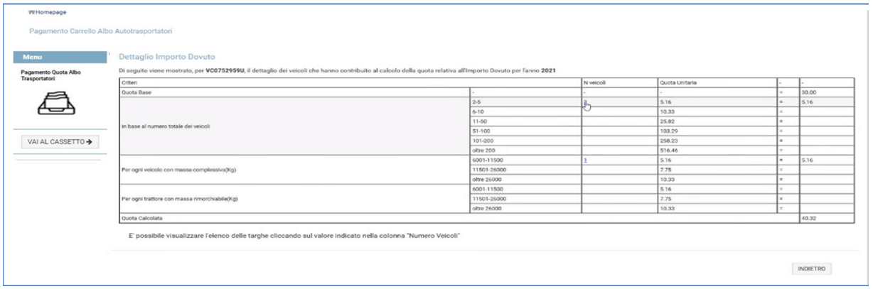 Dal dettaglio dell’“Importo dovuto”, sarà altresì possibile visualizzare l’elenco delle targhe associate ai veicoli che hanno contribuito al calcolo della quota albo.