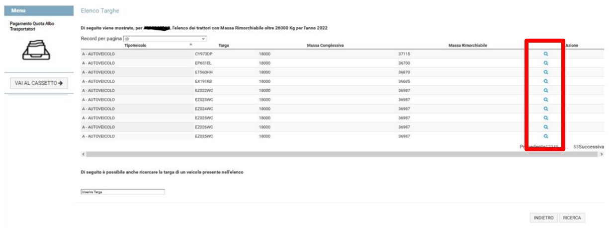 La destinazione tecnica del veicolo è accessibile anche cliccando la lente di ingrandimento contenuta nella colonna “Destinazione Tecnica Veicolo”.