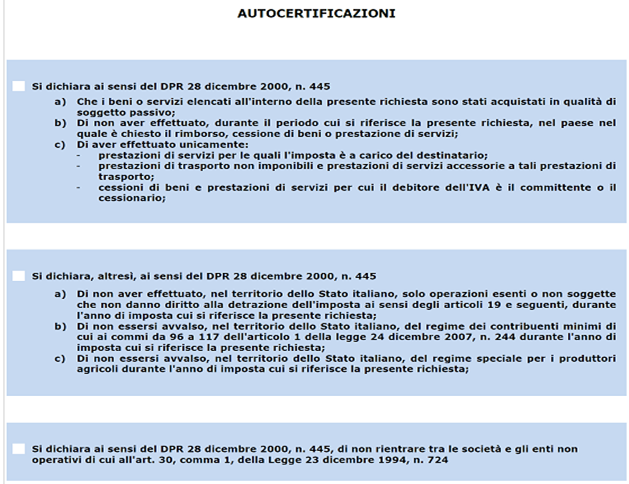 - Autocertificazione del possesso di alcune condizioni necessarie affinché il soggetto passivo sia legittimato a chiedere il rimborso