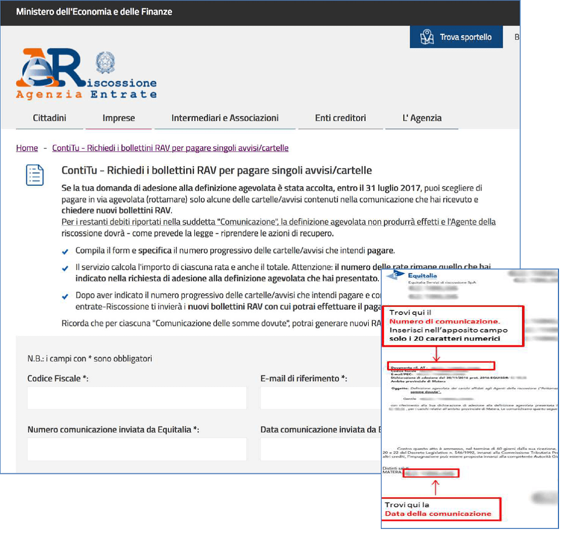 A tal fine, è sufficiente compilare il form “Richiesta comunicazione” presente nella sezione del sito dedicata alla definizione agevolata, riportando il proprio codice fiscale e la casella e-mail dove si desidera ricevere la comunicazione ed allegando la documentazione necessaria al riconoscimento.
