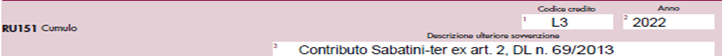 Pertanto, ad esempio, se la società Alfa Srl, nel corso del periodo d’imposta 2022, ha acquistato un bene strumentale “generico” beneficiando del credito d’imposta con codice L3, nonché al contempo anche del contributo Sabatini, il rigo RU151 del modello Reddito 2023 deve essere compilato come di seguito.