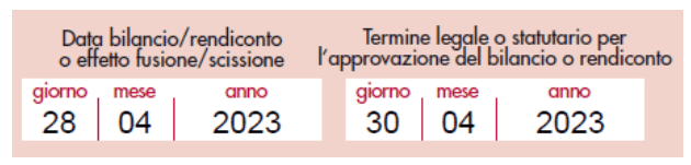 • al campo “Termine legale o statutario per l’approvazione del bilancio o rendiconto”, deve essere indicata la data del 29 giugno 2023.