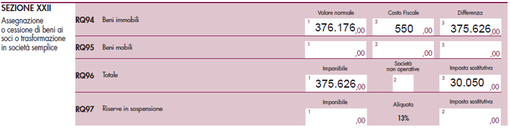 L’importo dell’imposta sostitutiva dovuta è stato calcolato applicando alla base imponibile (375.626 euro) – determinata come differenza tra il valore catastale dell’immobile (376.176 euro) e il corrispondente costo fiscalmente riconosciuto (550 euro) – l’aliquota dell’8%, siccome la società non è risultata essere di comodo.