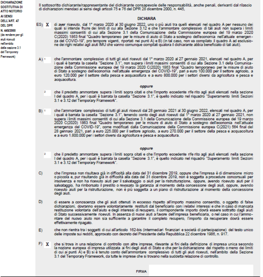 La modalità semplificata di compilazione del nuovo modello di autodichiarazione consiste nella possibilità di barrare la nuova casella ES, presente all’inizio del riquadro “Dichiarazione sostitutiva di atto notorio ai sensi dell’art. 47 del D.P.R. n. 445/2000” successivo al riquadro dedicato all’indicazione del rappresentante firmatario, beneficiando del conseguente esonero dalla compilazione del quadro A e quindi dall’indicazione del dettaglio degli aiuti fruiti.