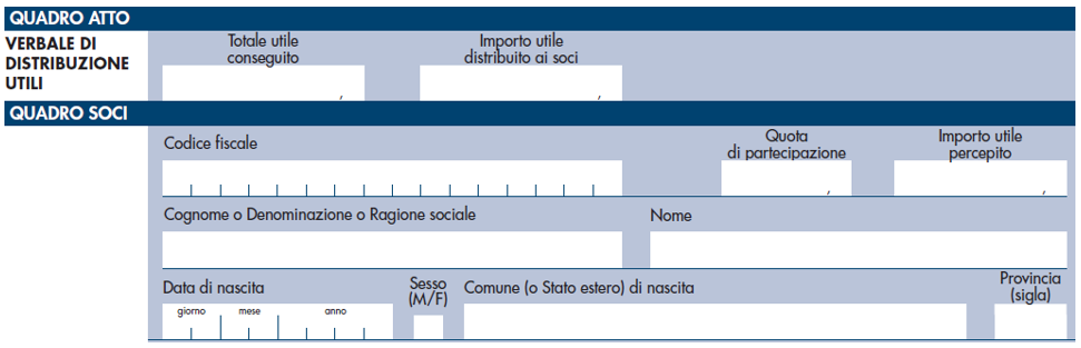 Nella sezione “Quadro soci” devono essere indicate le generalità dei soci a cui viene distribuito l’utile se menzionati nel verbale (se i soci non sono menzionati o se la compagine societaria è composta da più di 20 soci il quadro in esame non deve essere compilato), nonché essere compilati i seguenti campi: