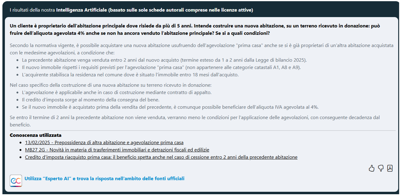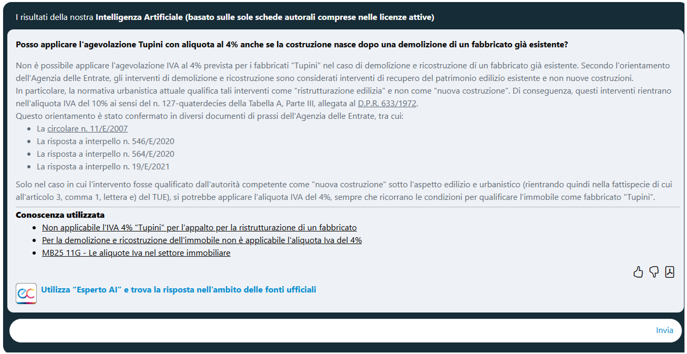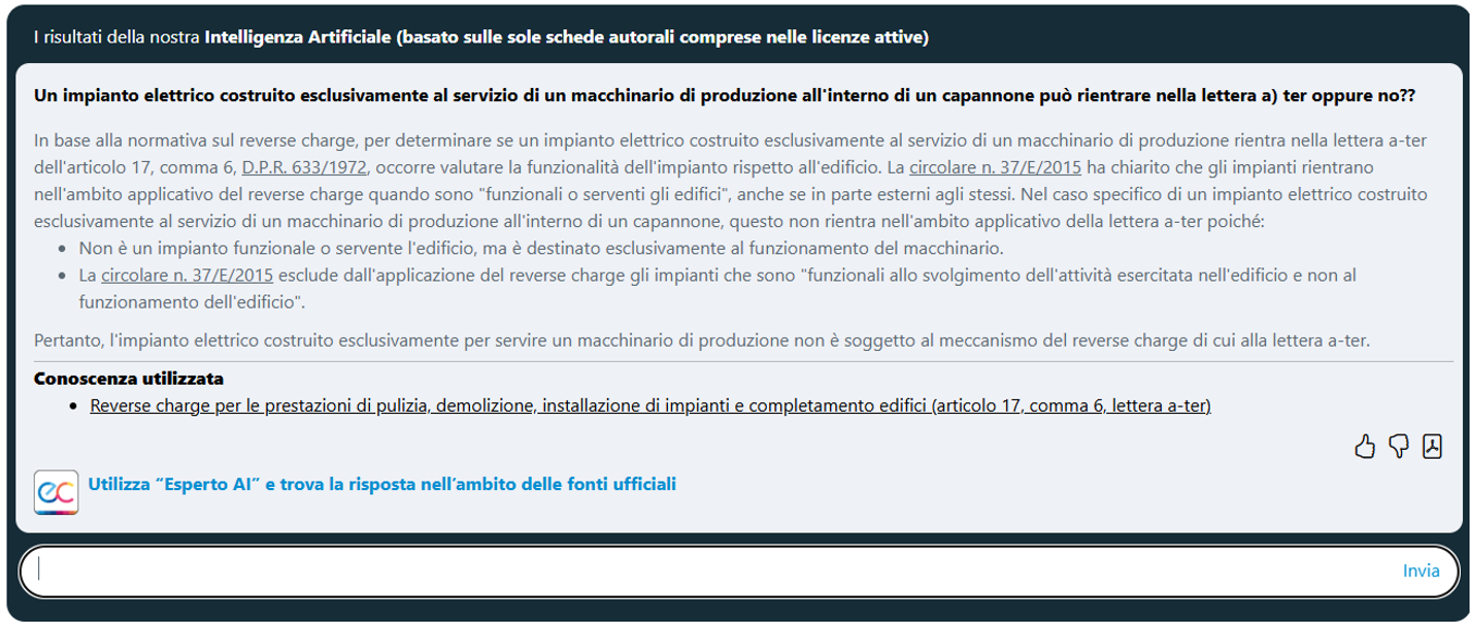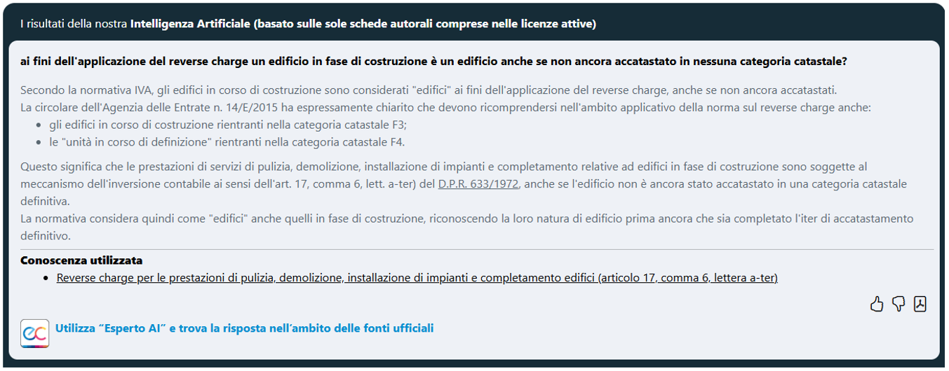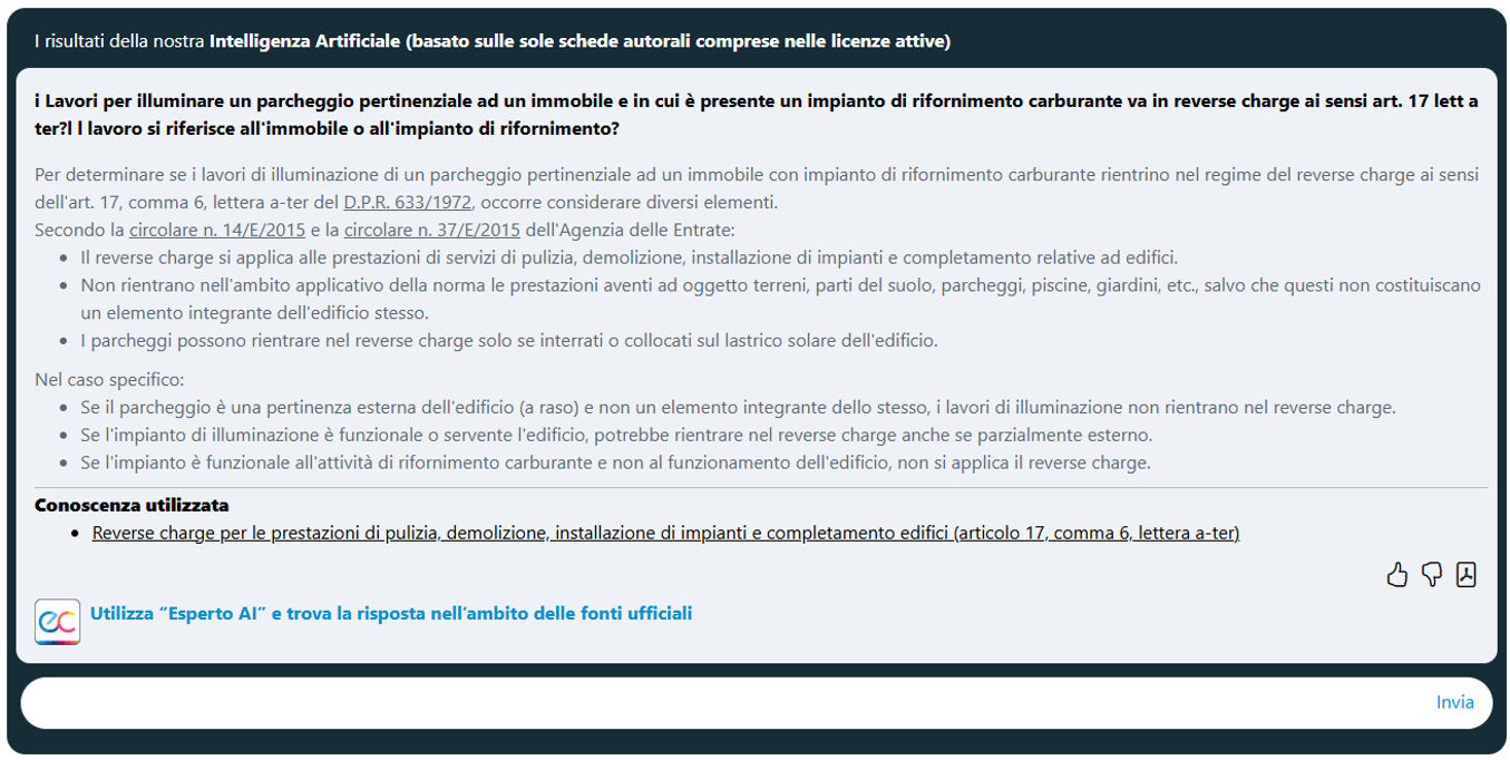 - Esperto AI e trova la risposta nell’ambito delle fonti ufficiali” che consente di estendere il perimetro della ricerca anche ai documenti di prassi Agenzia delle entrate ed alla normativa ufficiale.
