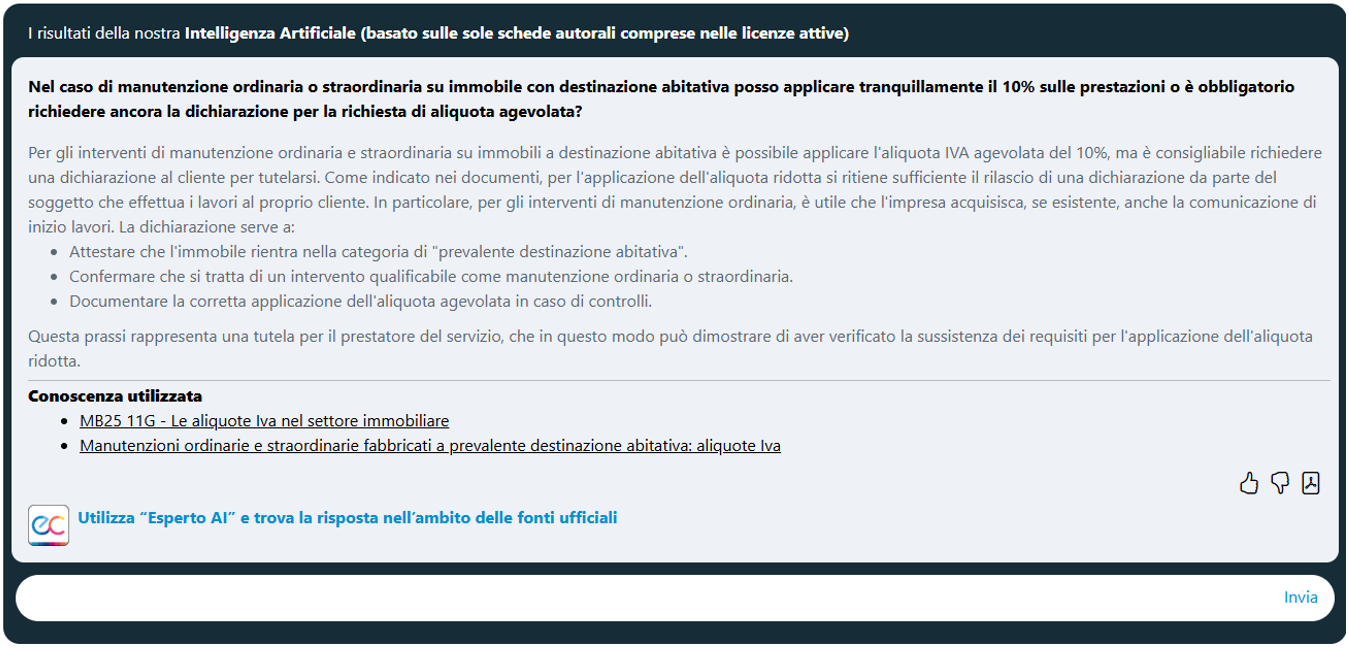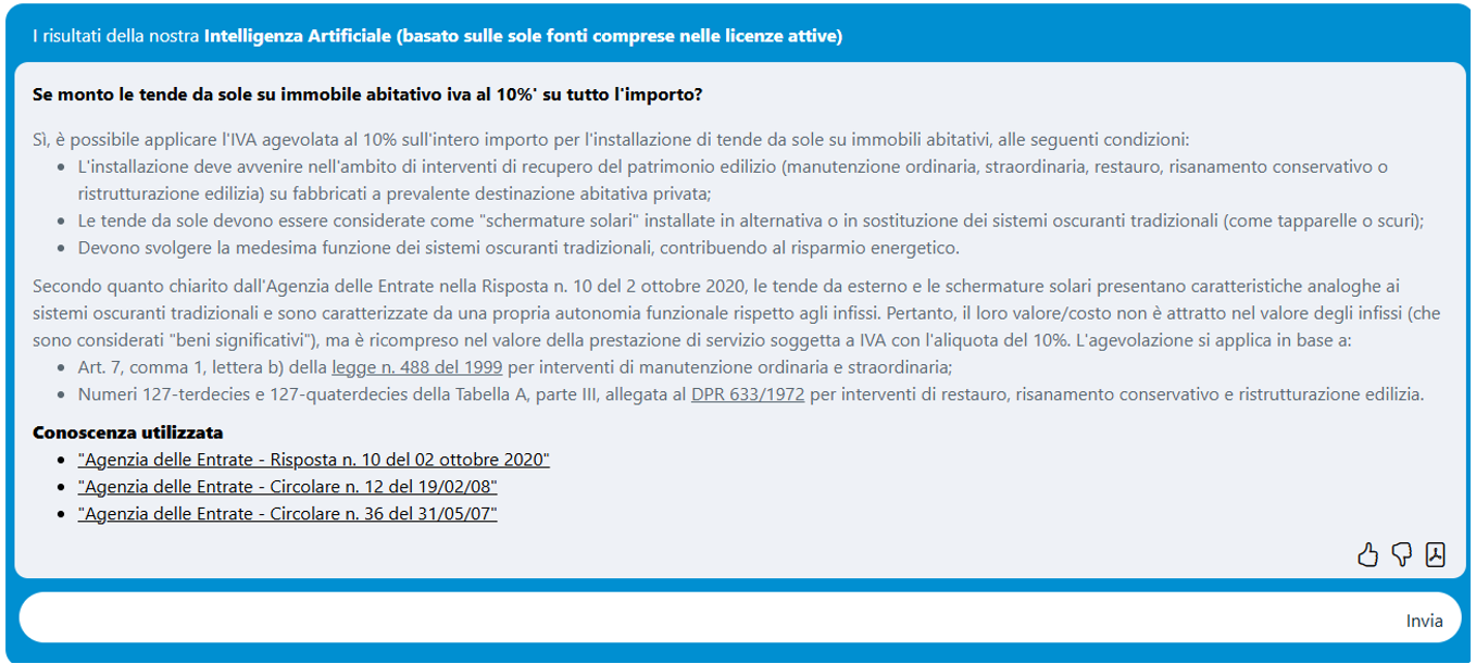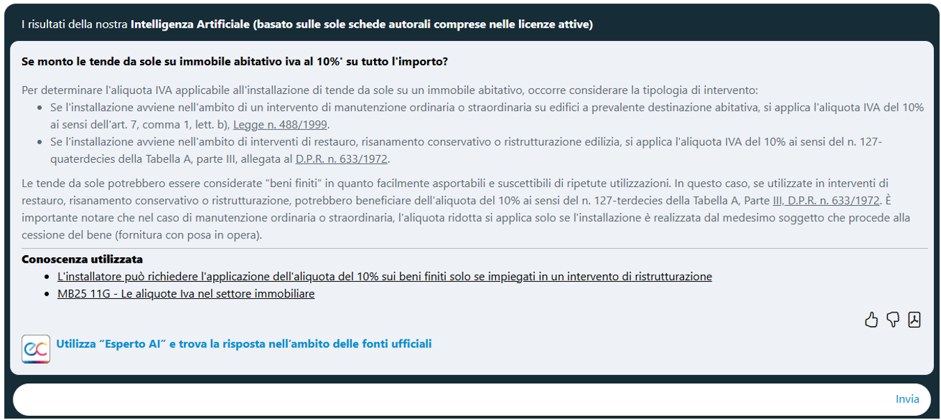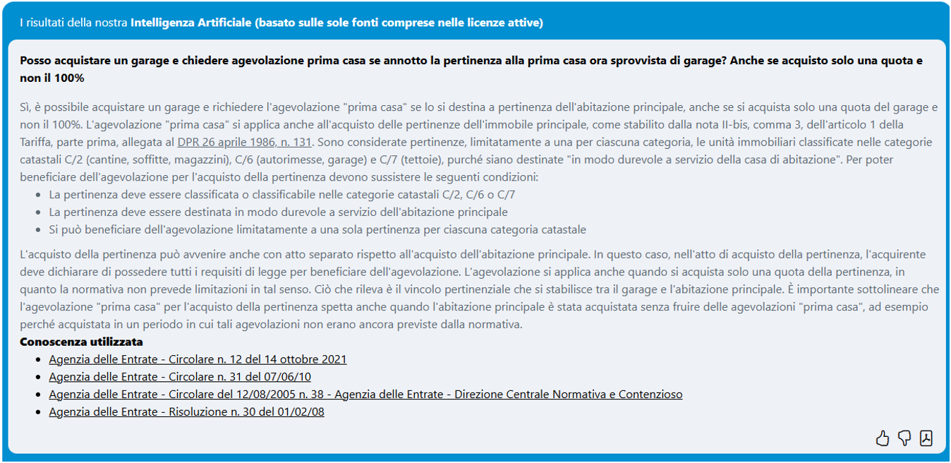 - Esperto AI e trova la risposta nell’ambito delle fonti ufficiali” che consente di estendere il perimetro della ricerca anche ai documenti di prassi Agenzia delle entrate ed alla normativa ufficiale.