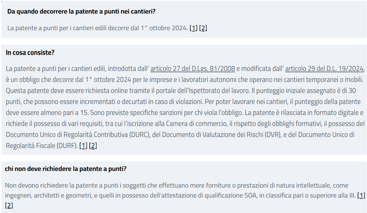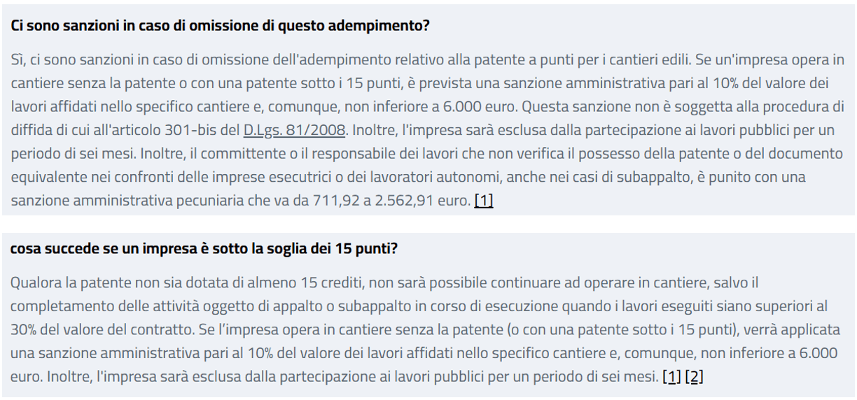 L’articolo 27, D.Lgs. 81/2008 (come sostituito dall’articolo 29, D.L. 19/2024) ha introdotto l’obbligo di munirsi della cd. patente a punti a partire dall’1.10.2024 per le imprese e per i lavoratori autonomi che operano nei cantieri temporanei o mobili (quindi qualunque luogo cui si effettuano lavori edili o di ingegneria civile). Il D.M. 132/2024 e la circolare Inl 23.9.2024 hanno fornito, rispettivamente, le modalità attuative e i primi chiarimenti in merito a tale obbligo