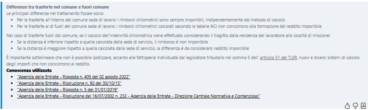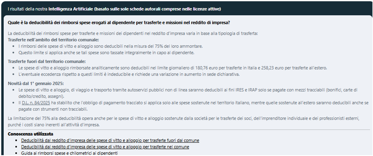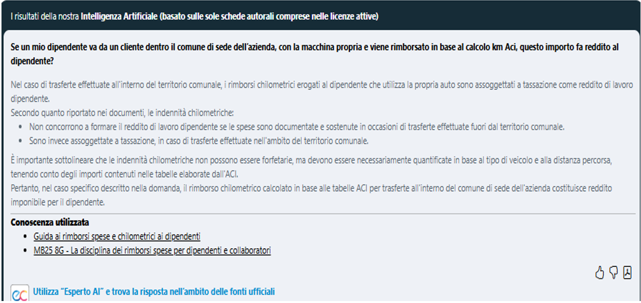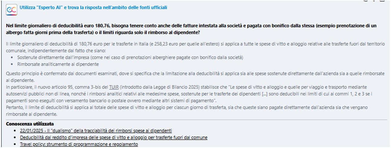 Abbiamo interrogato il nostro sistema di intelligenza artificiale sulla novellata disciplina dei rimborsi spese, utilizzando anche la nuova funzionalità “Esperto AI e trova la risposta nell’ambito delle fonti ufficiali”, a cui è possibile accedere cliccando in calce alla chatbot, al fine di allargare il perimetro della conoscenza utilizzata per la risposta ai quesiti,  oltre ai contenuti delle schede autorali (curate dai professionisti del Centro Studi Euroconference), anche ai documenti di  prassi Agenzia delle entrate e alle sentenze della Giurisprudenza di legittimità. Inoltre, con la funzionalità di “Esperto AI” è possibile richiedere la predisposizione di modelli per la corretta rendicontazione delle spese di trasferta.