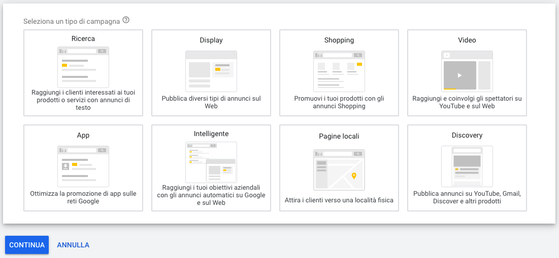Al momento Google Ads offre 8 diverse tipologie di campagne che elenchiamo di seguito:
