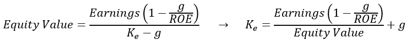 - Un approccio “inverso” per cui il costo del capitale del mercato (quindi rf + ERP, perché il beta del mercato è sempre pari a 1) è calcolato utilizzando le formule che la teoria economica ci ha fornito per calcolare il valore di un target ponendo, in questo caso, come incognita il costo del capitale invece del valore (che è pari al prezzo attuale delle azioni). Ad esempio: