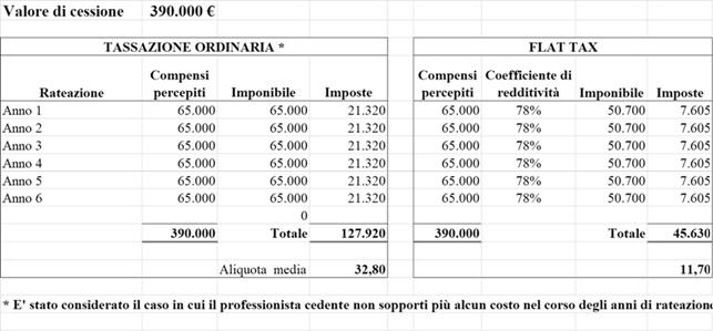 Appare subito evidente il risparmio fiscale derivante dall’accesso al regime della flat tax. Nell’esempio sopra riportato, infatti, l’aliquota media risulta pari al 11,7%, contro un’aliquota media del 32,80% in caso di tassazione ordinaria (calcolata sulla base degli odierni scaglioni Irpef anche per gli anni successivi). Un ulteriore vantaggio per il cedente è quello di avere la possibilità di poter pianificare nel medio lungo periodo i propri flussi finanziari, in combinazione con la propria posizione pensionistica e anticipando così la tempistica della cessazione totale o parziale della propria attività. Ad esempio, un professionista che dovesse maturare il diritto alla pensione a 65 anni potrebbe, di fatto, cessare la sua attività già a 60 anni godendo per i primi 5 anni della rendita derivante dalla cessione dello studio per poi andare in pensione. Da parte acquirente il principale vantaggio è quello di poter pianificare in un periodo più lungo i pagamenti relativi allo studio acquisito.