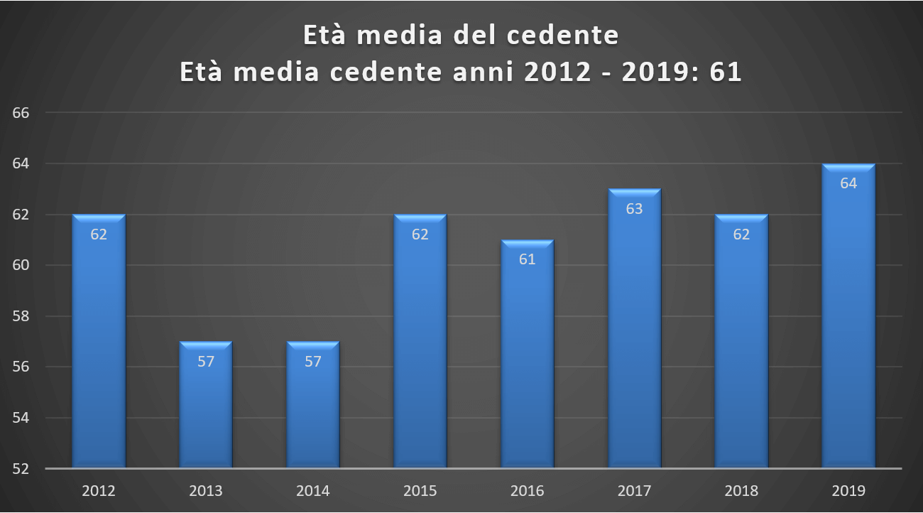 La fondazione nazionale di ricerca dei commercialisti, con il rapporto 2019, ha evidenziato che circa il 17% degli iscritti ha più di 60 anni d’età. Anche i dati rilevati da MpO Centro Studi confermano quanto indicato dal rapporto. Infatti, così come indicato nel seguente grafico, nel corso dell’anno 2019 l’età media del professionista cedente è di 64 anni con una media di 61 anni nel periodo 2012 – 2019.