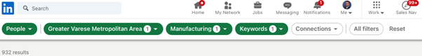 Quella che ho usato qui si chiama stringa booleana e consente di unire più valori: la funzione OR (sempre in maiuscolo) fa capire a LinkedIn che voglio incontrare persone che nell’ambito manifatturiero in provincia di Varese siano titolari O imprenditori O imprenditrici O proprietari. Indipendentemente da come si definiscono su LinkedIn, voglio parlare con loro!