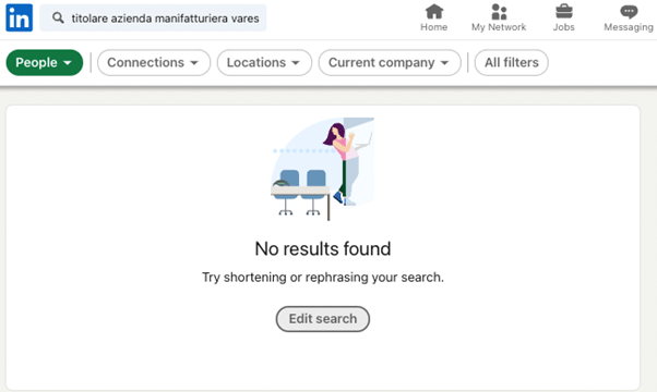 Vediamo cosa succede facendo una ricerca verbatim su LinkedIn: scriviamo “titolare azienda manifatturiera varese” su LinkedIn, clicchiamo “Invio” e assicuriamoci di selezionare il filtro “People” per focalizzare la ricerca sui risultati di persone.