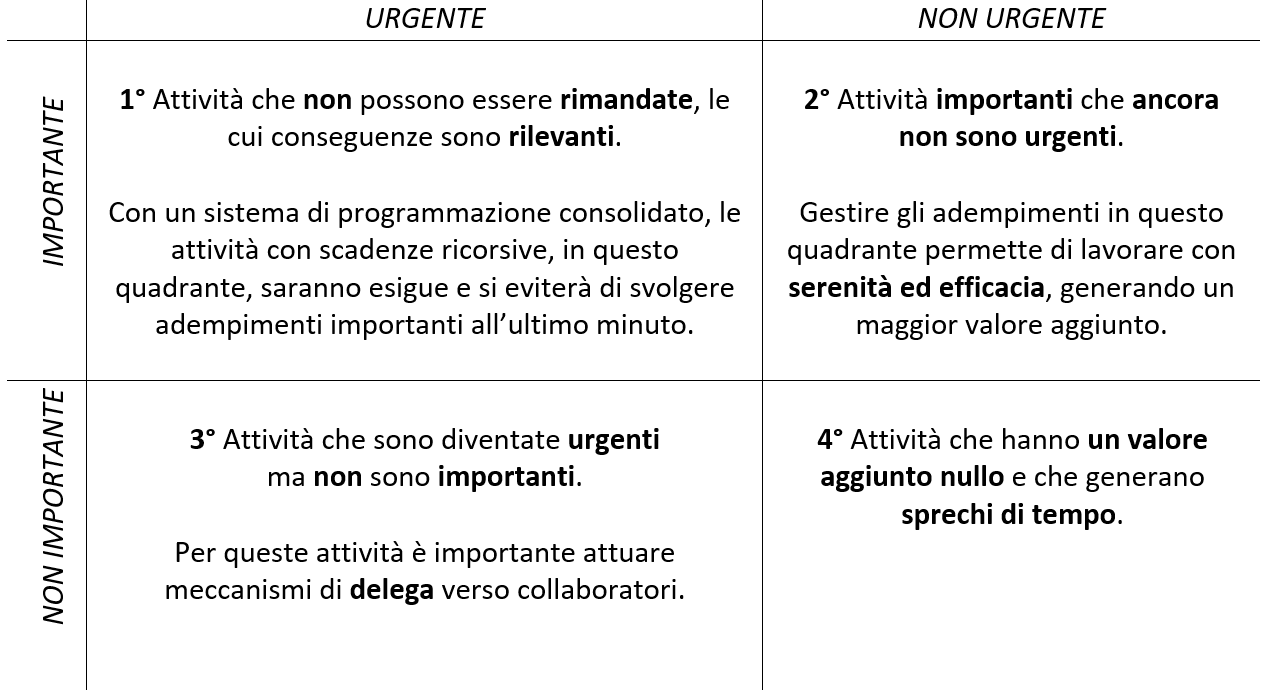 Un ulteriore strumento utile ad aumentare la consapevolezza circa la tipologia degli impegni a cui si stanno dedicando energie, è la Matrice di Eisenhower che permette di classificare le attività in quattro quadranti a seconda del loro grado di importanza e urgenza.