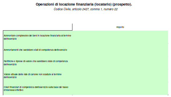 Nella rilevazione dell’operazione di leasing finanziario in bilancio, il citato principio della prevalenza della sostanza sulla forma può in un certo senso ritenersi rispettato in base alle prescrizioni contenute nell’articolo 2727, comma 1, n. 22 del cod. civ., il quale prevede che la nota integrativa della società utilizzatrice debba contenere un prospetto da cui risulti: