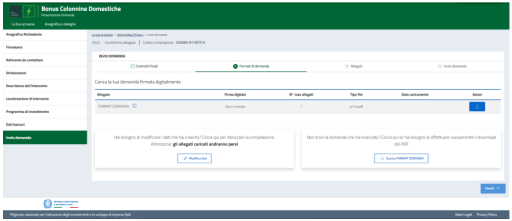 - Carica il Format della domanda firmato;