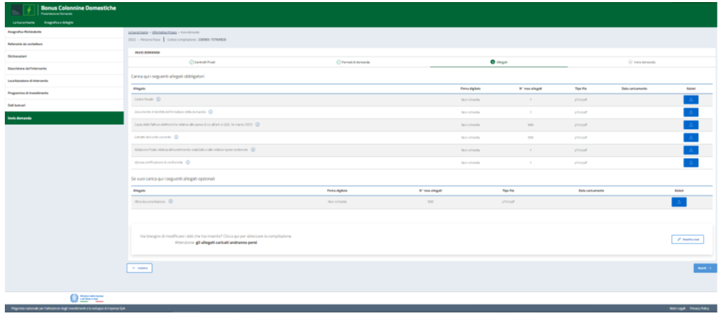 - Carica gli allegati obbligatori richiesti ed eventuali allegati facoltativi;