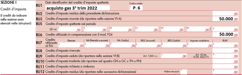 Esemplificando, il credito di imposta riconosciuto alle imprese diverse da quelle a forte consumo di gas naturale per il terzo trimestre 2022, è esposto nel quadro RU della dichiarazione dei redditi SC2023 con il codice P6.