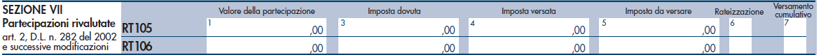 I soggetti che si sono avvalsi della facoltà di rivalutazione ex L. 160/2019 e D.L. 34/2020 devono compilare la Sezione VII denominata “Partecipazioni rivalutate articolo 2 D.L. n. 282 del 2002 e successive modificazioni” del quadro RT del modello Redditi PF 2021.