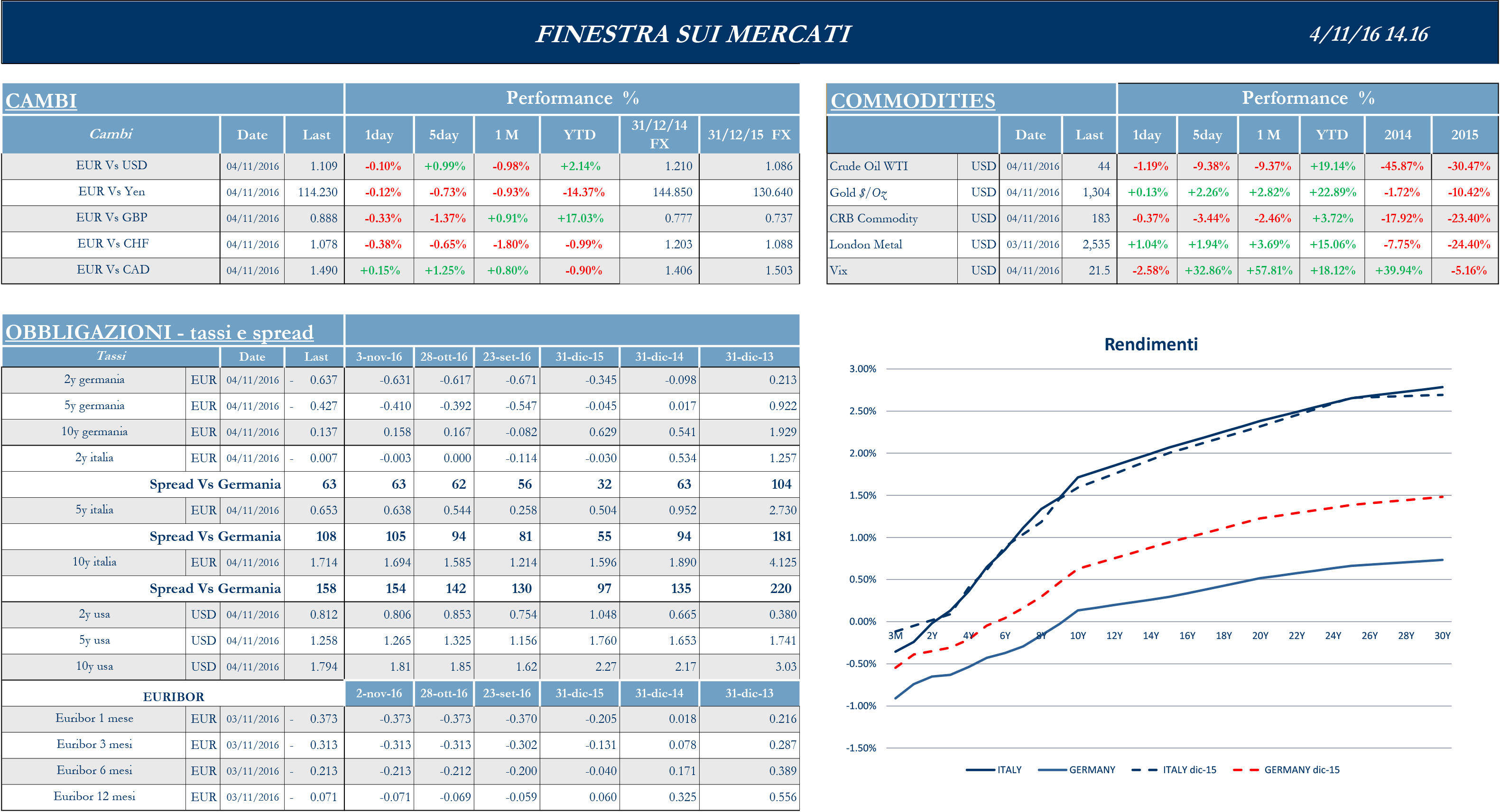 Mercati globali ampiamente negativi nella settimana antecedente le elezioni presidenziali negli Stati Uniti. La crescente incertezza ha provocato un aumento dell’avversione al rischio degli investitori, favorendo i beni rifugio. Il mercato statunitense ha registrato un’altra performance negativa in uno dei trend decrescenti tra i più lunghi dalla crisi finanziaria. Oltre alla pubblicazione delle ultime trimestrali societarie vi sono avute numerose notizie di aggiornamento dello scenario macroeconomico: la riunione del FOMC di novembre, il report del mercato del lavoro di ottobre nonché pubblicazione dell’indice dei direttori d’acquisto nel settore manifatturiero relativa al mese di ottobre. Lo scenario macroeconomico conferma un miglioramento delle condizioni economiche del paese. Questo miglioramento è stato recepito anche dalla Federal Reserve che pur non modificando i tassi di interesse nel meeting di novembre, ha recepito il miglioramento congiunturale segnalando che una nuova stretta monetaria è probabile a dicembre. Condividono i pesanti ribassi le borse europee ed asiatiche. In Europa, alle influenze statunitensi si aggiungono le tensioni politiche legate al referendum italiano e al settore bancario, oltre alla discussione in seno alla Banca Centrale Europea (BCE) sul futuro della politica monetaria nell’area ed un possibile riduzione del piano di acquisto di titoli da parte dell’autorità monetaria, che potrebbe essere annunciata nella riunione dell’otto dicembre. Questa settimana si sono susseguite numerose dichiarazioni da parte dei membri del consiglio direttivo: da un lato Coeure ha affermato che la mancanza di politica fiscale da parte dei governi dei paesi membri non dà alla BCE la scusa per fare meno, dall’altro Weidmann ha continuato a sottolineare i rischi di una politica monetaria ultra espansiva. In ultimo si è espresso Lars Feld, uno dei cinque saggi del governo tedesco, secondo il quale Draghi dovrebbe presto annunciare che interromperà il QE a marzo e con un tapering (ovvero di una riduzione del piano di acquisti da parte della Bce) più rapido rispetto a quello utilizzato dalla Fed. In Gran Bretagna l’Alta Corte inglese ha imposto al Governo di ottenere un mandato parlamentare prima di attivare le procedure di uscita dall’UE. A meno che la Corte Suprema non rovesci il verdetto, questo potrebbe allungare i tempi dell’intero processo. In Asia, il Giappone soffre del rafforzamento dello yen sul dollaro e di dati macro contrastati, mentre la performance migliore resta quella delle piazze cinesi, anche grazie a dati macro positivi per la ripresa dell’economia; in Australia, il rapporto sulla politica monetaria della RBA prevede la ragionevole prospettiva di una crescita economica sostenibile, escludendo di fatto nuovi tagli dei tassi a breve, grazie alla solida domanda cinese che sostiene materie prime e commercio.