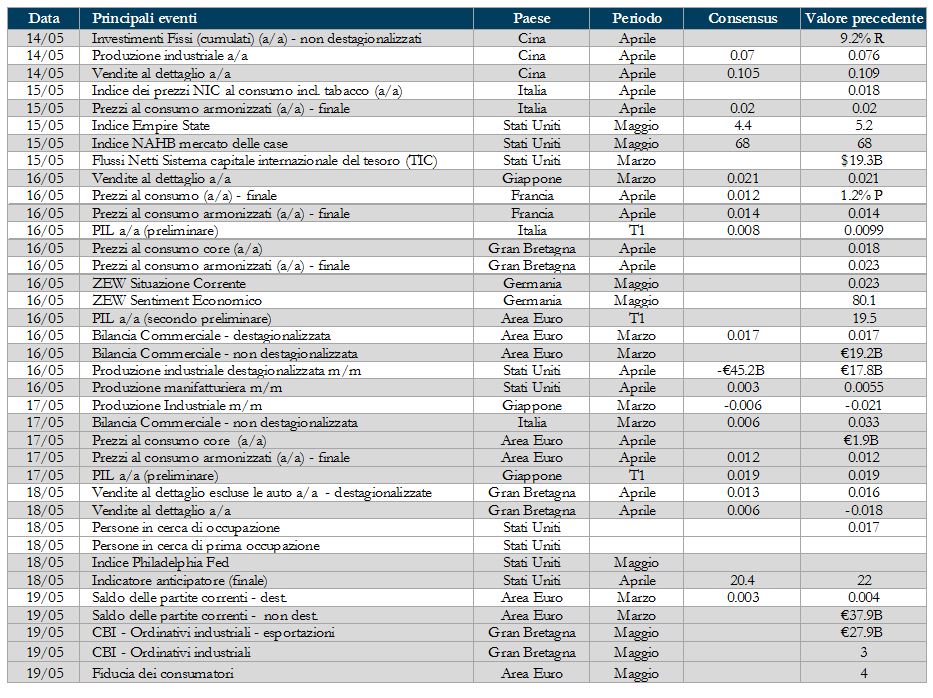 - Asia:. In Cina sarà pubblicata la produzione industriale e le vendite al dettaglio, mentre il focus in Giappone sarà su PIL e prezzi alla produzione.