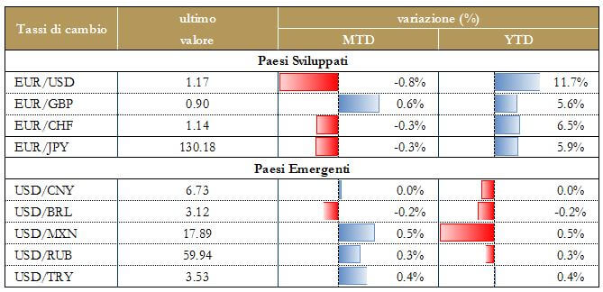I paesi emergenti stanno, invece, beneficiando della debolezza del dollaro e della gradualità del processo di normalizzazione della politica monetaria degli Stati Uniti. In Asia, l’economia cinese continua a mostrare segnali incoraggianti, crescendo in T2 del 6.9% a/a, al di sopra delle attese e allineandosi a quanto registrato nei primi tre mesi del 2017. Il risultato si accompagna agli ottimi dati sulla produzione industriale, cresciuta a giugno del 7.6% a/a, superando il 6.5% a/a registrato a maggio. I dati cinesi restano coerenti con il contemperamento dei due obiettivi del governo: ridurre i rischi finanziari e raggiungere una crescita pari al 6.5% nel 2017.