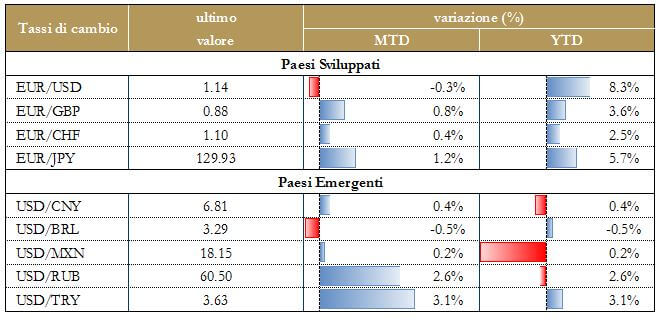 I verbali della riunione di metà giugno confermano il messaggio già emerso nello statement e nei successivi discorsi dei membri del FOMC che hanno chiarito la volontà della Fed di proseguire nel processo di normalizzazione della politica monetaria ed espresso la preoccupazione del Consiglio per la debolezza dell’inflazione. Probabilmente in settembre la Fed inizierà ufficialmente a ridurre lo stock di titoli detenuti in bilancio, riducendo il reinvestimento dei titoli stessi, mentre il prossimo rialzo dei tassi verrà, con elevata probabilità, annunciato a dicembre. La Fed avrebbe, così, tempo fino a dicembre per osservare lo sviluppo della traiettoria dell’inflazione prima di implementare il prossimo rialzo. Notizie positive dall’indice ISM manifatturiero che si è attestato a giugno a 57.8 punti, in aumento dai 54.9 del mese precedente Anche l’indice ISM relativo ai servizi è in salita e registra a giugno 54.2 punti rispetto ai 53.0 precedenti. Miste le indicazioni proveniente dal report del mercato del lavoro: nonostante il report Adp, che ha visto a giugno un incremento di 158 mila unità, al di sotto del consenso (185 mila), i NFP superano ampiamente le attese salendo a 222 mila unità. La disoccupazione risale lievemente al 4.4%. Ancora modesta la pressione salariale emersa dai dati dei salari orari.