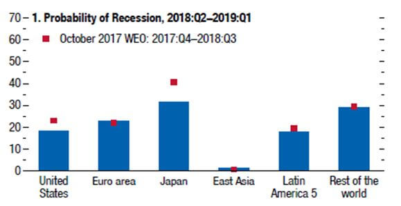 Secondo il Fondo monetario internazionale (FMI) nel prossimo biennio 2018-2019 la crescita mondiale proseguirà solida, a un tasso annuo pari a 3,9%, supportata dall’elevata fiducia degli operatori, da condizioni finanziarie accomodanti e dalle ricadute internazionali e locali della politica fiscale espansiva degli Stati Uniti. Il Word Economic Outlook, rilasciato in settimana, sottolinea che veniamo da un anno, il 2017, in cui la crescita mondiale si è rafforzata raggiungendo il 3,8%, a seguito di un notevole rimbalzo nel commercio internazionale, una ripresa sostenuta degli investimenti nelle economie avanzate e di segnali di ripresa in diversi paesi esportatori di materie prime. Per questo, il 2017 ha visto due terzi dei paesi, che producono circa tre quarti del PIL globale, sperimentare una crescita più veloce rispetto all’anno precedente e ai massimi del 2010. Secondo il FMI, nei prossimi due anni le economie avanzate cresceranno sopra il potenziale, con la crescita nell’Area Euro, che resta ancora guidata da una politica monetaria accomodante mentre quella degli Stati Uniti dall’allentamento della politica fiscale, che in un certo senso quest’anno ha preso a prestito parte della crescita futura, anticipandola. Il parziale il recupero dei prezzi delle materie prime consentirà un miglioramento graduale delle condizioni economiche dei paesi esportatori. Tale miglioramento, congiuntamente con lo slancio atteso in India, controbilancerà in parte il graduale rallentamento della Cina. A medio termine, invece, la crescita globale è vista rallentare (3,7% a/a): una volta che lo slancio ciclico e gli stimoli fiscali statunitensi avranno fatto il loro corso, le prospettive per le economie avanzate resteranno limitate, a causa del loro basso potenziale di crescita.Con una crescita più forte, la probabilità di una recessione in un orizzonte di oltre quattro trimestri (T2 2018 – T1 2019) è diminuita nella maggior parte delle regioni, rispetto alla probabilità calcolata ad ottobre 2017 (cfr. figura sottostante). Il rischi di deflazione, misurato dalla probabilità di deflazione nei prossimi quattro trimestri, contestuale ad un output-gap negativo è generalmente diminuito. Nel Area Euro, però, la probabilità è aumentata modestamente a causa degli effetti base legati all’andamento del prezzo del petrolio.