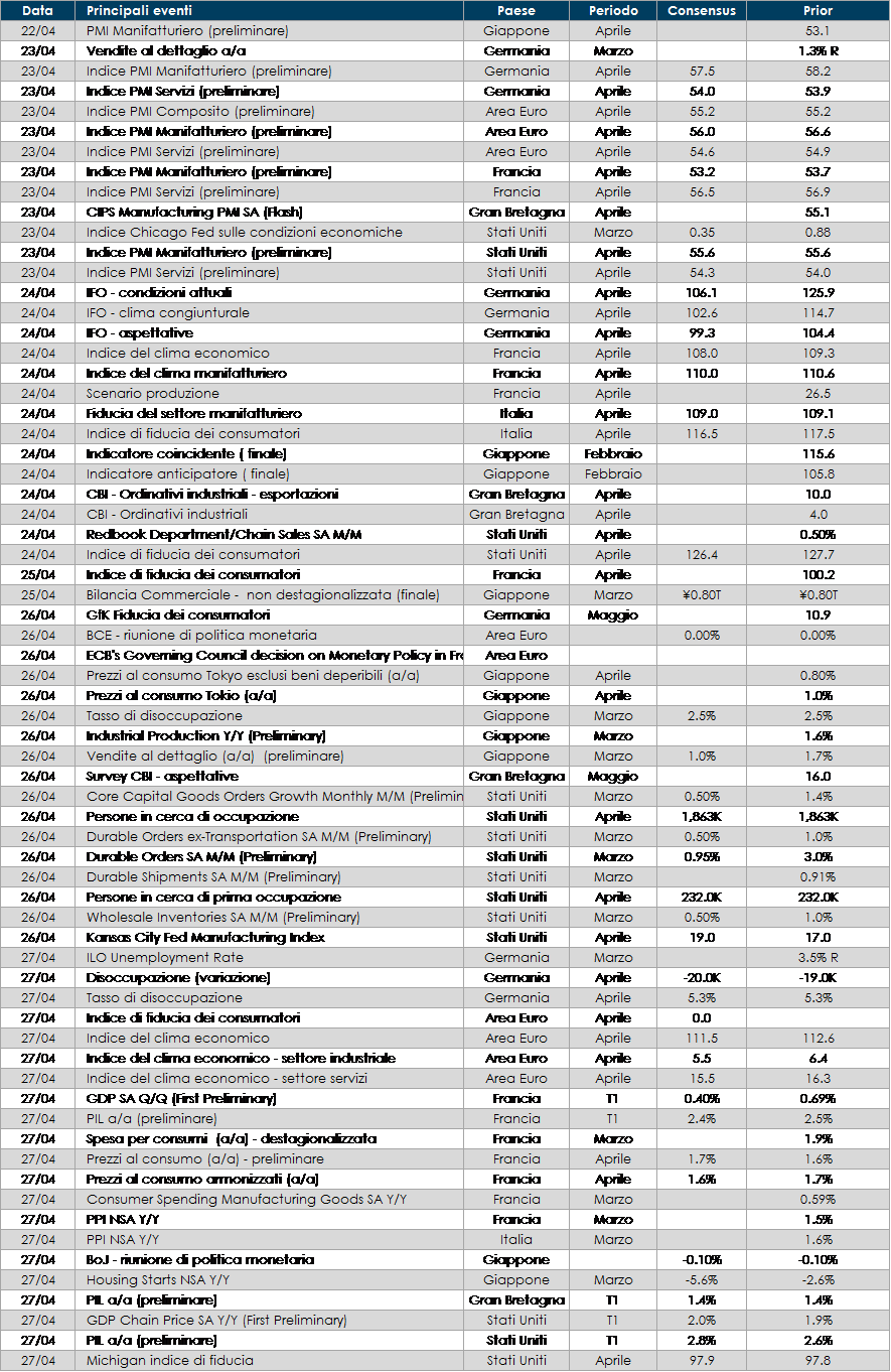- Europa: l’attenzione sarà principalmente rivolta alla riunione di politica monetaria della BCE. Inoltre saranno disponibili alcune indagini di fiducia del mese di aprile (PMI, IFO, INSEE).