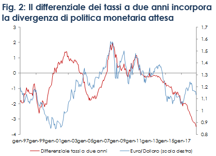 Fig. 2: Il differenziale dei tassi a due anni incorpora la divergenza di politica monetaria attesa
