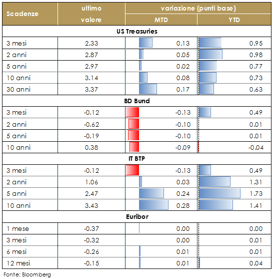 Durante il mese di ottobre i rendimenti dei titoli di stato statunitensi hanno continuato ad aumentare, guidati dalla componente reale, e la loro struttura a termine ha aumentato la propria inclinazione. Sull’altra sponda dell’Atlantico i rendimenti dei Bund sono scesi marginalmente, mentre le note vicende relative alla legge di bilancio Italiana hanno fatto aumentare i rendimenti dei BTP sulle scadenze a medio lungo termine.Questa settimana in Giappone, la riunione della BoJ si è conclusa, come atteso, mantenendo invariati i parametri di politica monetaria, votati con 7 voti a favore e 2 dissensi. I tassi a breve termine sono rimasti a meno 0,1%, mentre sono state mantenute le indicazioni di possibili fluttuazioni dei rendimenti a 10 anni intorno allo zero, in un intervallo determinato dagli sviluppi dell’economia e dei prezzi, e sono stati riconfermati gli acquisti di JGB “flessibili”, ma mirati a una variazione annua di +80 tln di yen, come indicato da agosto in poi. Inoltre la BoJ prevede che l’inflazione non raggiungerà l’obiettivo del 2% almeno fino a marzo 2021 con maggiori rischi al ribasso sull’economia e sui prezzi rispetto al rialzo potenziale. Nella conferenza stampa, Kuroda ha ribadito che i rischi per lo scenario di crescita e inflazione sono verso il basso e che la BoJ manterrà tassi estremamente bassi per un periodo esteso, sottolineando che la banca centrale ha come obiettivo l’inflazione e non il cambio, competenza del ministro delle finanze.