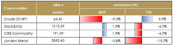 I fondamentali macroeconomici sono solidi, le condizioni finanziarei ancora accomodanti e lLa crescita degli utili favorevole. Restiamo positivi sul comporta azionario, anche se tatticamente, alla luce dell’accentuarsi di fattori di rischio, legati alle minacce di protezionismo US e all’aumento dell’incertezza politica in Europa, riteniamo opportuno ridurre marginalmente l’esposizione azionaria a favore di attivi denominati in USD |