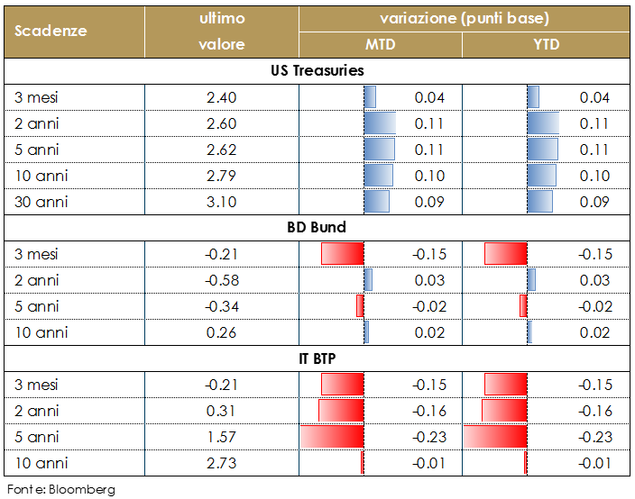 VIEW STRATEGICA Governativo US Il ciclo economico è solido e la Fed continuerà ad alzare il costo del denaro, proseguendo il percorso iniziato a dicembre 2015. Tuttavia, il movimento di rialzo tassi registrato sulle principali scadenze, incorpora buona parte di tali aspettative, riportando in territorio neutrale le valutazioni e con esse la view sull’asset class. Governativo Euro. Il ciclo economico è solido e la Fed continuerà ad alzare il costo del denaro, proseguendo il percorso iniziato a dicembre 2015. Tuttavia, il movimento di rialzo tassi registrato sulle principali scadenze, incorpora buona parte di tali aspettative, riportando in territorio neutrale le valutazioni e con esse la view sull’asset class |