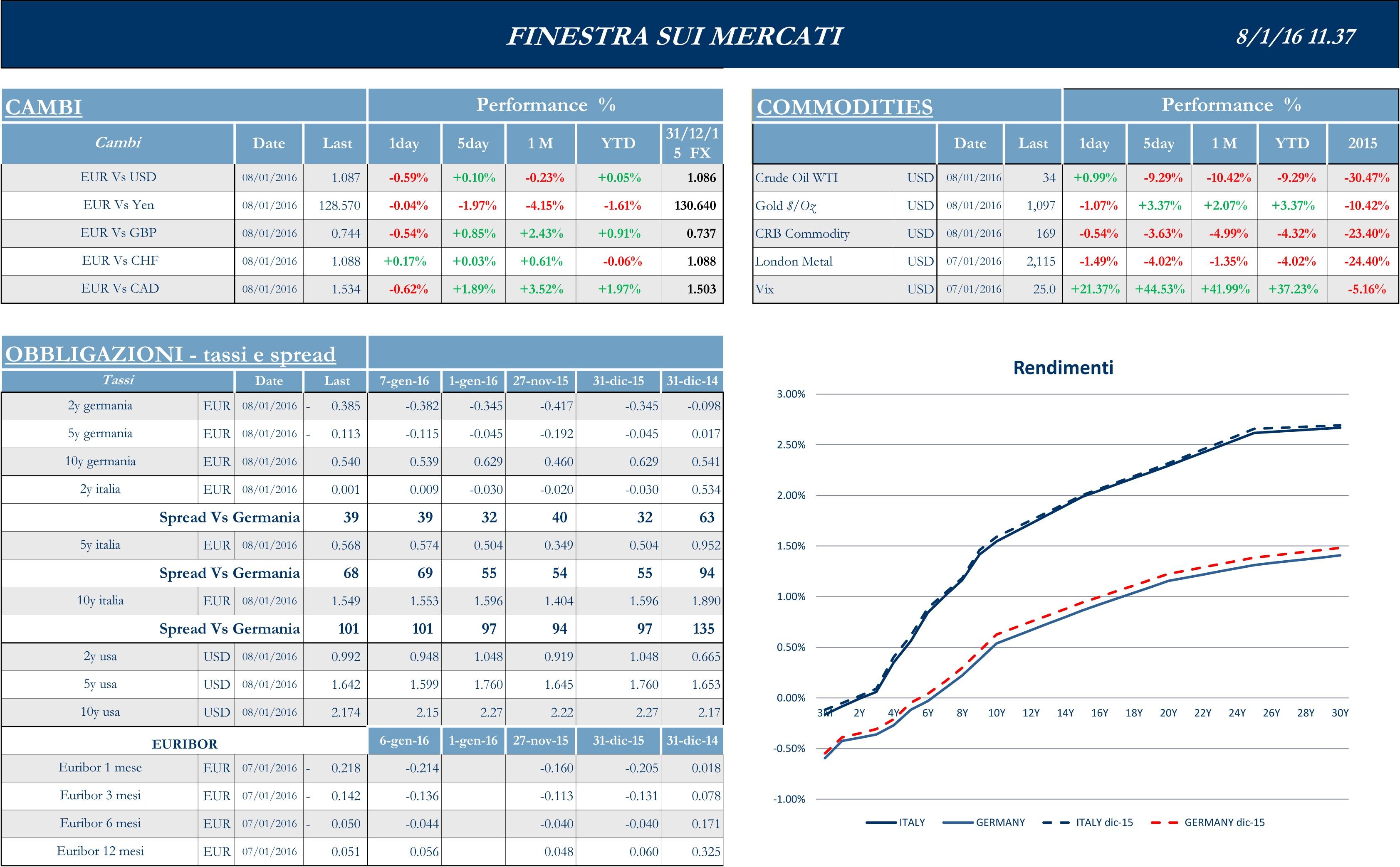 La prima settimana dell’anno, dopo due settimane corte dovute ai periodi di festività, è iniziata, su tutti i listini globali, tra le incertezze che hanno caratterizzato il secondo semestre del 2015, ovvero: le tensioni geopolitiche, sempre presenti in Medioriente, le nuove paure legate agli esperimenti di armi supposte, a idrogeno, da parte della Corea del Nord, i persistenti timori sull’economia cinese, i ribassi continui del petrolio e i rialzi del costo del denaro negli Stati Uniti. In particolare, dopo il crollo dei listini cinesi, a metà settimana, in Europa le borse vedono un livello di volatilità non toccato da oltre un decennio, e i timori persistenti della comunità finanziaria si sono tradotti, in questi ultimi giorni, in una delle più rapide avversioni al rischio di sempre, per gli investitori al rientro dalle festività. Ancora evidente il declino dei prezzi delle commodities, cui le tensioni in medioriente non riescono a dare che un limitatissimo supporto: da metà del 2014 i prezzi del greggio sono crollati del 70%, colpiti da un eccesso di offerta da parte dei principali produttori, ulteriormente esacerbato dal rallentamento della Cina, secondo paese consumatore di petrolio al mondo. La debolezza dell’andamento dell’inflazione induce, inoltre, gli investitori a scommettere su ulteriori azioni espansive da parte della BCE. I rendimenti dei titoli di Stato italiani e della zona Euro sono scesi ai minimi dal 3 dicembre scorso, quando Francoforte ha annunciato il prolungamento del Quantitative Easing. Solo oggi, sembra essere tornata una certa calma sui mercati, come segnala l’andamento positivo dei listini asiatici, mentre Tokyo ha limitato le perdite.